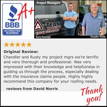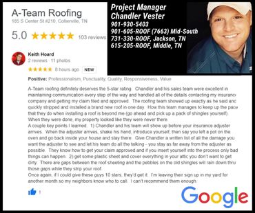 "A-Team Roofing is a fantastic company and it's employees are top-notch. I recently had a roof installation after an insurance claim and my wife and I are so very pleased, the roof looks amazing. The Project Manager (Blake) was outstanding, knowledgeable, and helpful. Blake made himself available for questions we had and he was there for the insurance inspections, Blake was there through the whole process. My family appreciated that very much, and the crew that did the installation was the very best. This experience was above and beyond our expectations, I will recommend A-Team Roofing and Project Manager Blake to anyone looking for anything concerning their roof." ~ David Lane