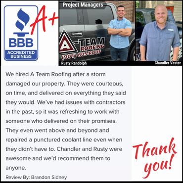 "Stop your search now and give them a call. It will be the best decision you ever make for your roofing needs. I recently bought my elderly mother a house and moved her in. A few days later we had an awful storm and realized we had a leak. I searched the web and BBB for a good roofer and found this company. They showed up within a few hours, answers all of my questions, were extremely helpful, professional and thorough. They saved me from having to buy a new roof with their knowledgeable insight and fixed the leak. Thanks so much to Blake. And thank you to A-Team for being an honest and dependable business." ~ Tracey Chastain
