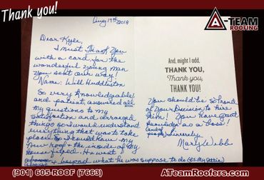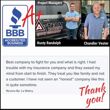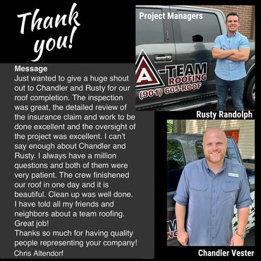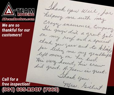 "A-Team did an excellent job on my roof this spring! I was so glad they could help me with my insurance! It's been three months, and we've had some very stormy weather. It's so nice to have a roof that doesn't leak anymore! I don't have to worry. They were very professional and did a great job cleaning up after the roof was put on. I've recommended them to several friends and neighbors!" ~ Ms. Wuday Thomas, Collierville, TN